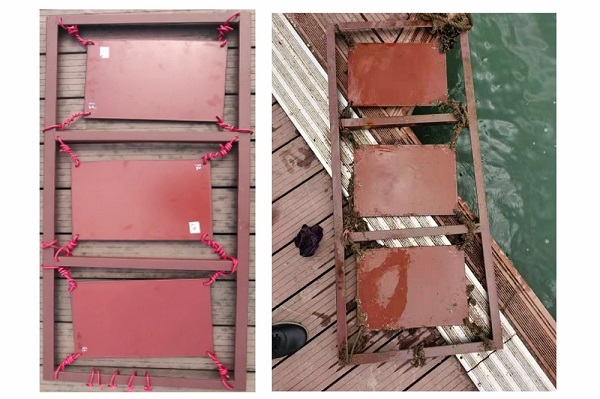 2019年8月,在中船某所的主持下,依照標準:GB/ 5370-2007防污漆淺海掛樣試驗方法,經(jīng)過一年在??诘姆栏牢蹝炱ǘ嗉覍Ρ龋┘铀賹嶒烌炞C,實驗結果顯示常州的江蘇泛亞微透科技股份有限公司新材料氣凝膠涂層的鋼板具有防腐蝕,防海生物附著的優(yōu)異效果;泛亞微透繼續(xù)將此掛片持續(xù)進行了3年的掛海試驗,試驗效果照片如下: